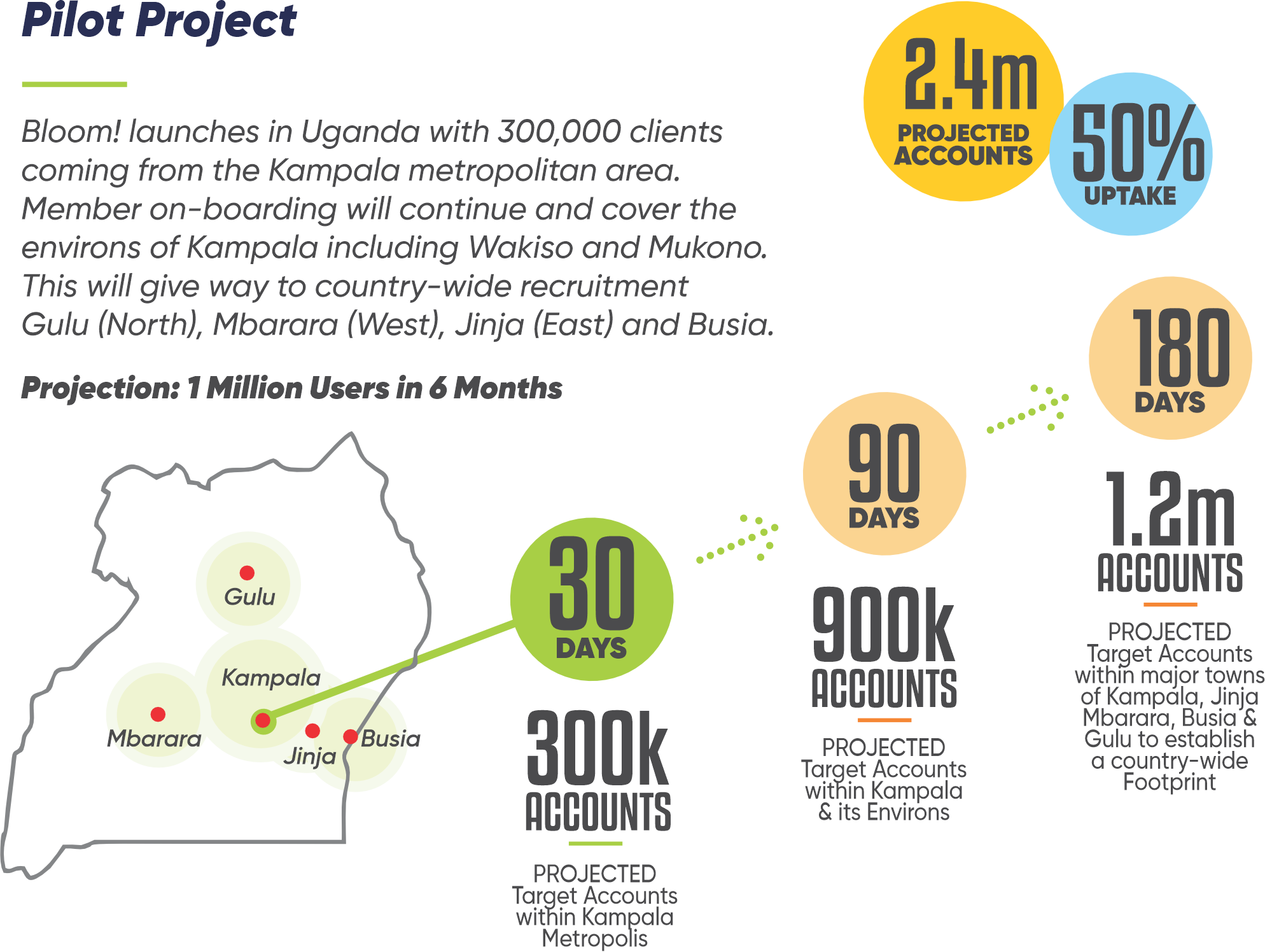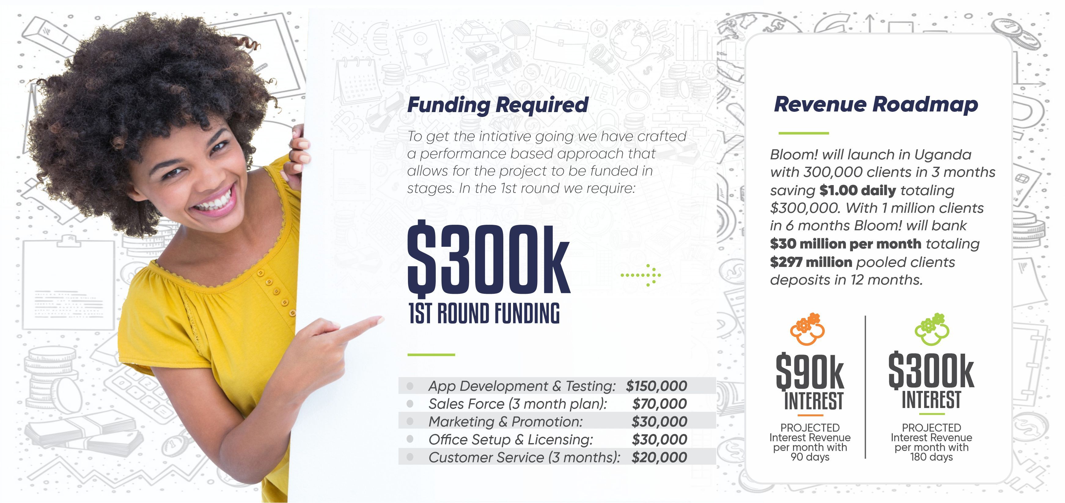 There are over 390 million registered mobile money accounts in East Africa with 55% active users. Bloom! can leverage 10% of this 210 million active users as our saving clients. We project 5% daily withdrawals at 3% transaction fees. The 33% revenue sharing with the telcos would the projected revenues are $1,764,000 million per year.Bloom! presents a unique opportunity for investors to tap into Africa’s fast-growing fintech landscape while creating measurable social impact. With over 400 million unbanked adults across the continent, there’s a massive untapped market for inclusive financial services. Bloom’s model—digital community savings and microcredit—targets this underserved segment with scalable, tech-driven solutions tailored to real grassroots needs.